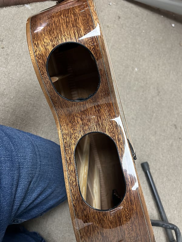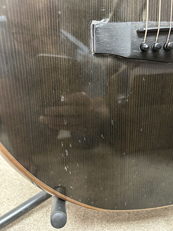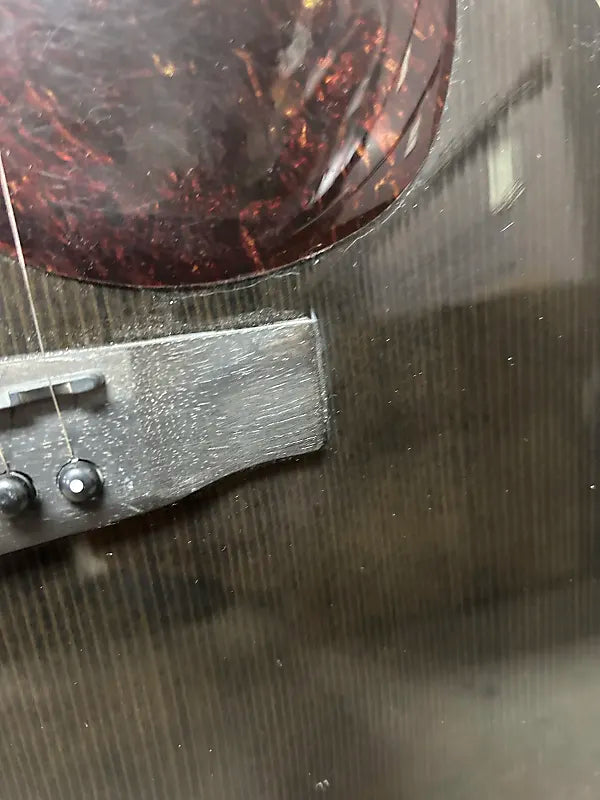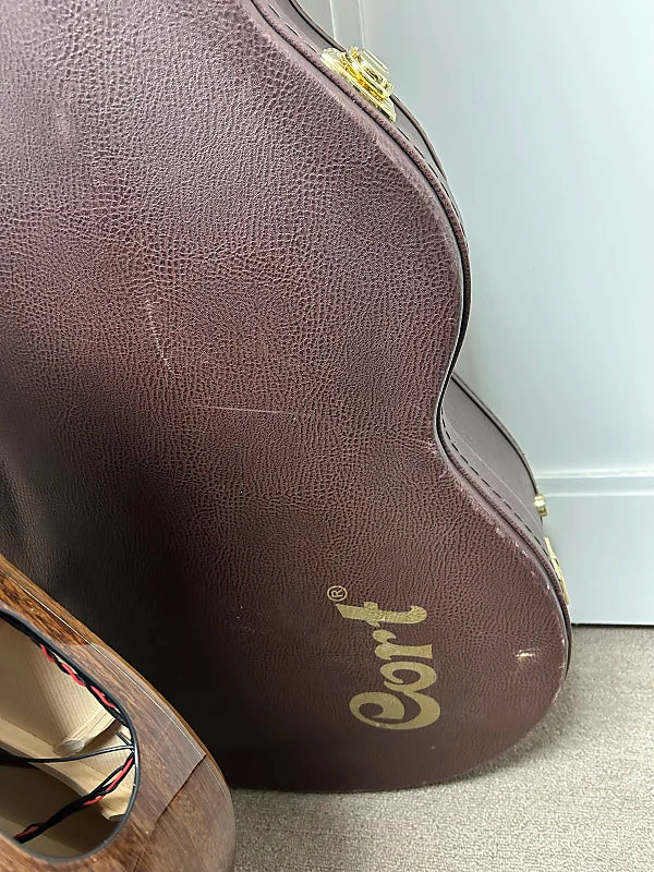 Cort Masterpiece Series Modern Black Venetian Cutaway Acoustic Guitar w/Electronics. Cosmetically ion pretty rough shape. Multiple dents, dings scratches and scuffs. But it sounds good and plays like it's supposed to. Electronics function as they should. There’s little to no fret wear. There are no buzzing or dead frets and the neck is straight. All our instruments are guaranteed to arrive in the described condition or they are returnable. Comes in the hard case