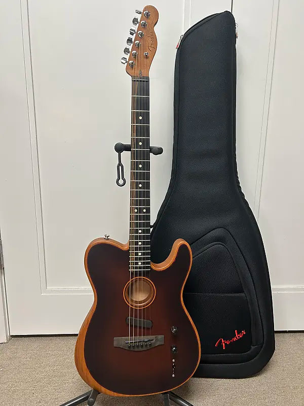 Fender American Acoustasonic Telecaster All-Mahogany - Bourbon Burst. It is in excellent condition with only light signs of use. There's no signs of significant damages or evidence of repairs. Electronics function as they should. There’s little to no fret wear. There are no buzzing or dead frets and the neck is straight. There is no cracking in the neck pockets or anywhere else on the guitar. All our instruments are guaranteed to arrive in the described condition or they are returnable.