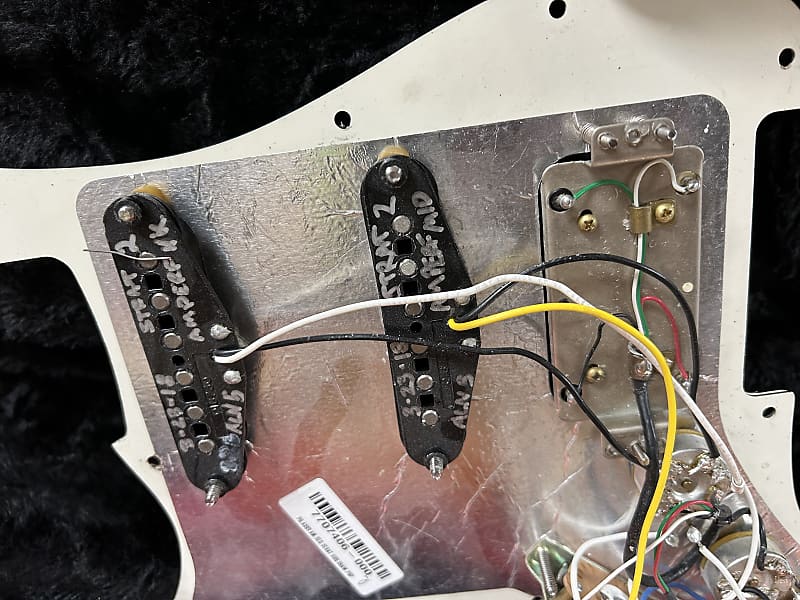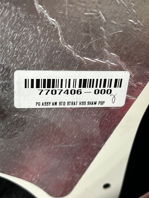It's been converted to HSS from SSS. New pickguard assembly is an American Standard Strat HSS Shawbucker. The pickup configuration appears to be: